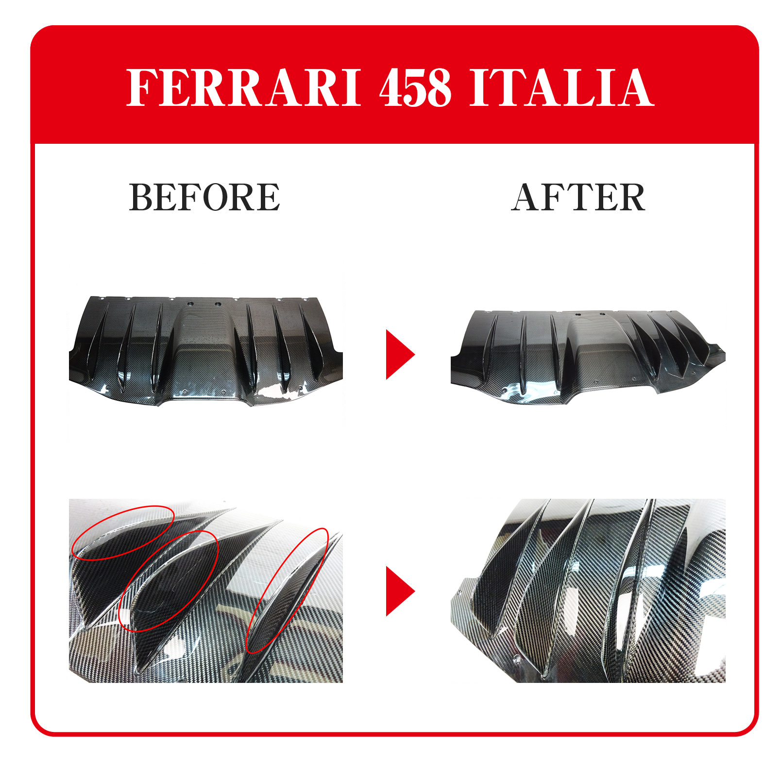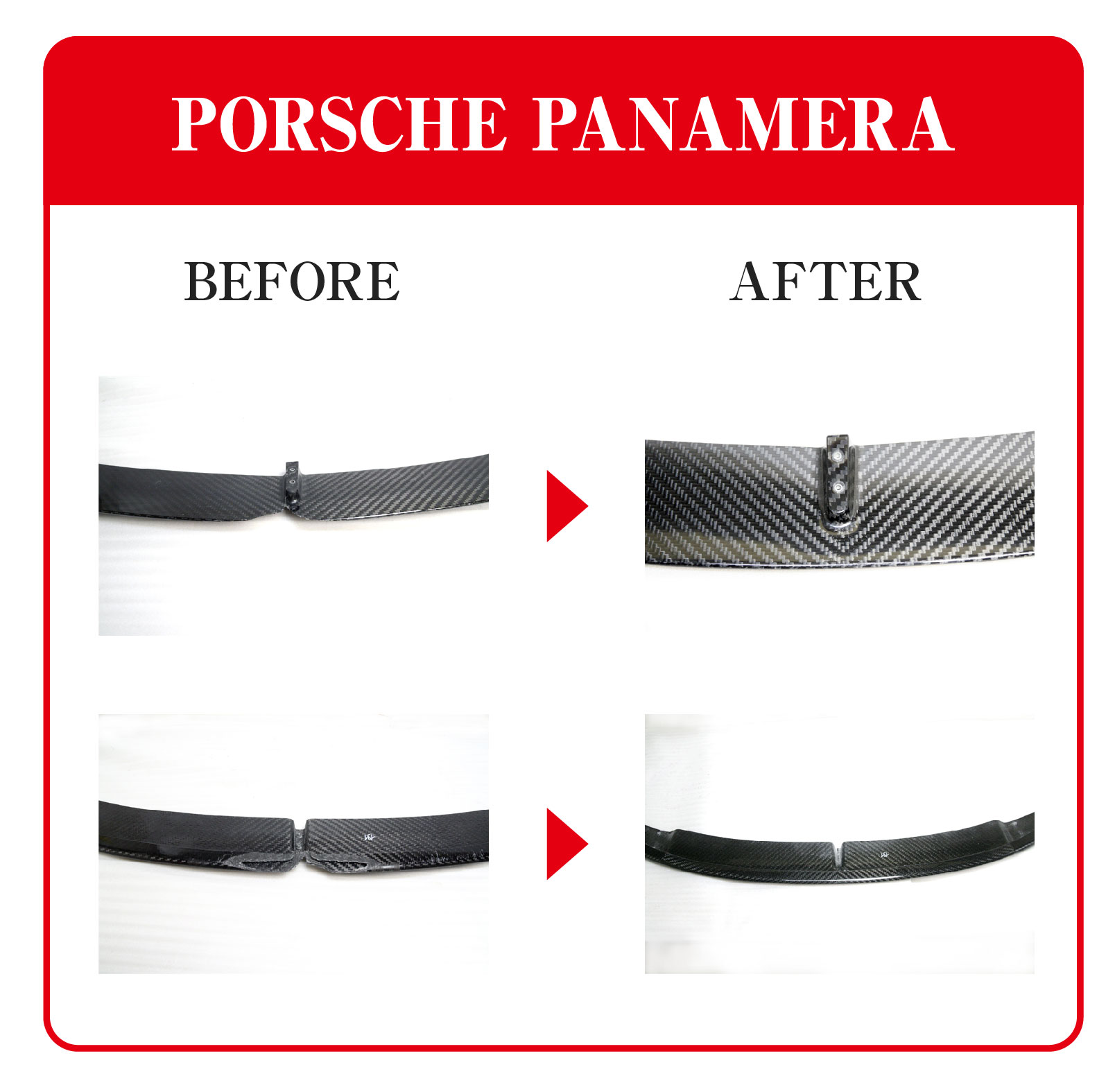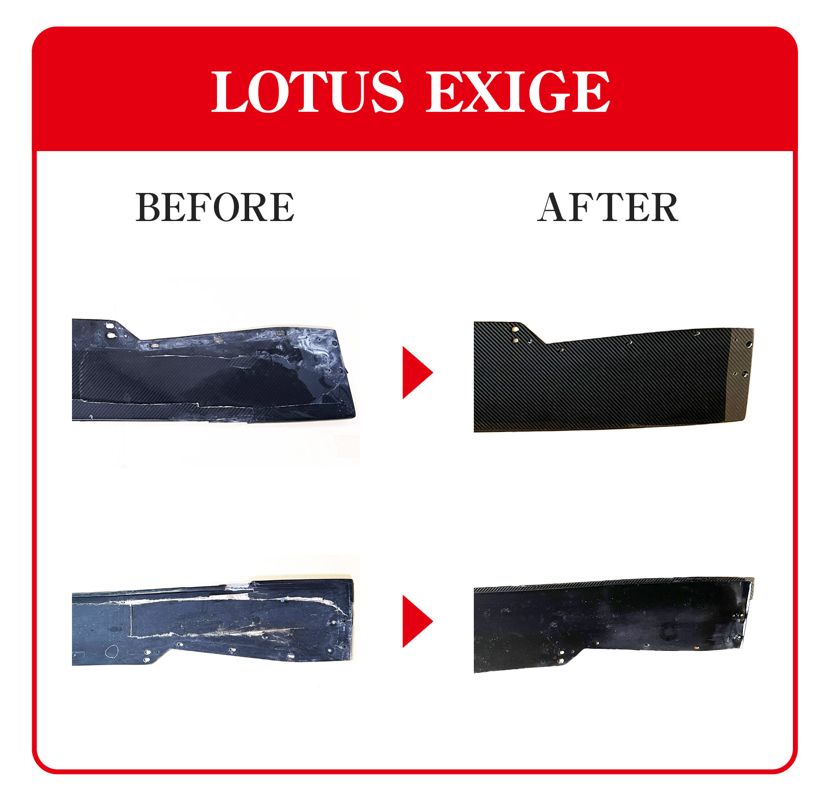 しかしながら、例えばフロントスポイラーやリアディヒューザーなどはとても低い位置に装着されており、バンピーな路面では下面をヒットしてしまうなど、気を使ってドライブしていても不本意な事は起こります。ところがカーボン製品を補修するという事はどのメーカーも基本的には行っておらず、交換対応のみとなります。しかし、それら製品は非常に高価であったり、また場合によっては入手までに非常に長い時間がかかる、もしくは納期が未定など、一筋縄にはいきません。カーボンドライジャパンは長年に渡り、ドライカーボン製品の製造と共にカーボン補修にも力を入れてきました。直せるものは直そうと。カーボン補修で重要な事は実用強度と同様にカーボン目の復元です。当然の事ですが、見た目はとても重要でカーボン製品の特徴である平織や綾織をどこまで拘って補修するのか、そのノウハウにおいて豊富な経験と実績があります。それぞれのお客様のご要望をお伺いして、最適な補修方法を検証してご提案致します。