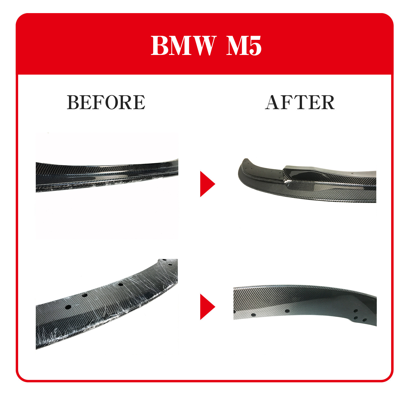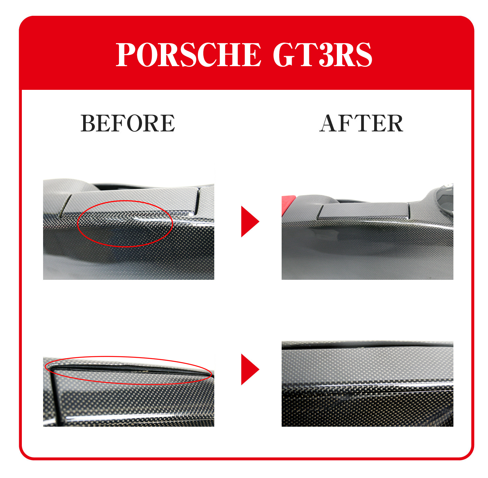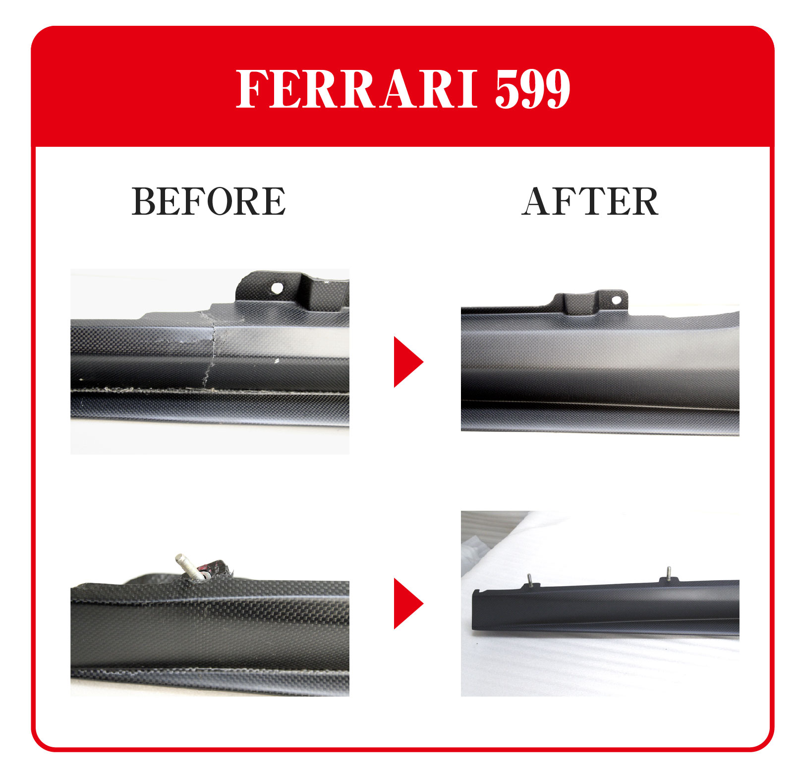 しかしながら、例えばフロントスポイラーやリアディヒューザーなどはとても低い位置に装着されており、バンピーな路面では下面をヒットしてしまうなど、気を使ってドライブしていても不本意な事は起こります。ところがカーボン製品を補修するという事はどのメーカーも基本的には行っておらず、交換対応のみとなります。しかし、それら製品は非常に高価であったり、また場合によっては入手までに非常に長い時間がかかる、もしくは納期が未定など、一筋縄にはいきません。カーボンドライジャパンは長年に渡り、ドライカーボン製品の製造と共にカーボン補修にも力を入れてきました。直せるものは直そうと。カーボン補修で重要な事は実用強度と同様にカーボン目の復元です。当然の事ですが、見た目はとても重要でカーボン製品の特徴である平織や綾織をどこまで拘って補修するのか、そのノウハウにおいて豊富な経験と実績があります。それぞれのお客様のご要望をお伺いして、最適な補修方法を検証してご提案致します。