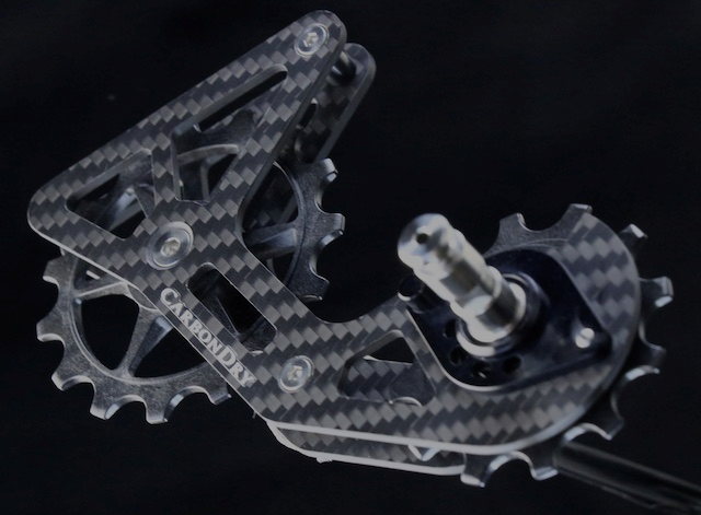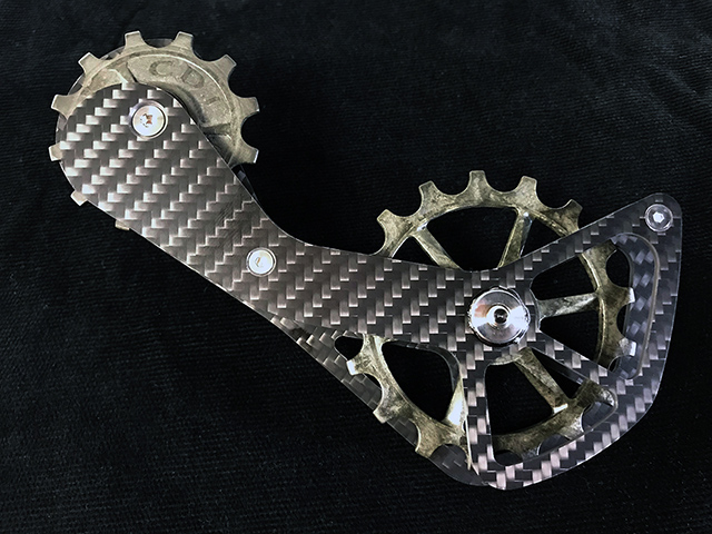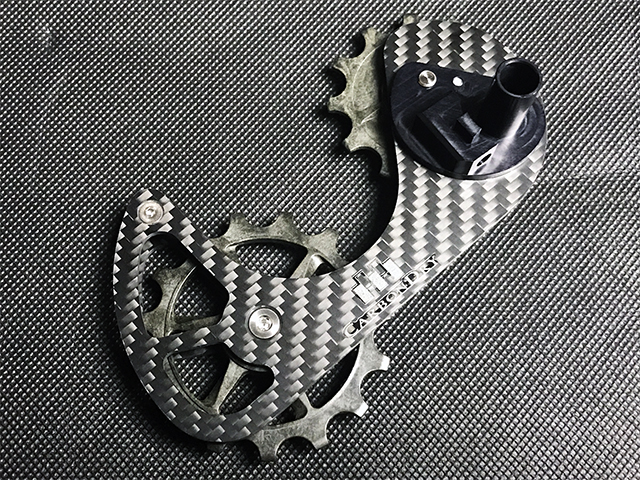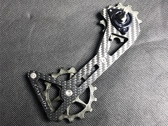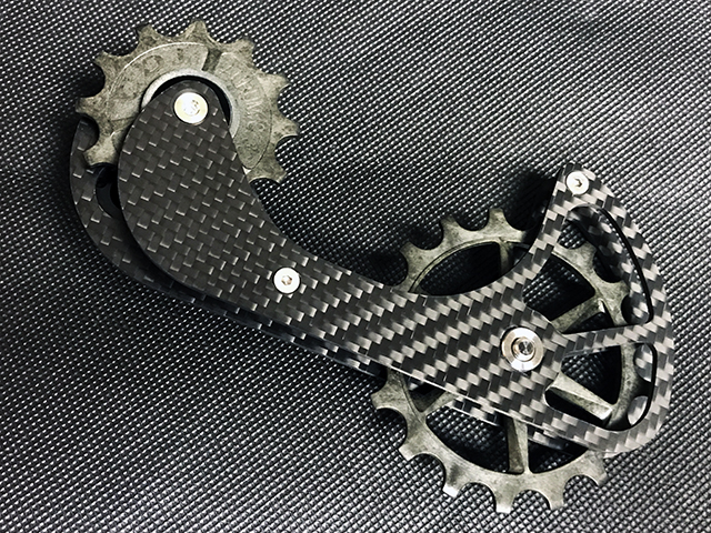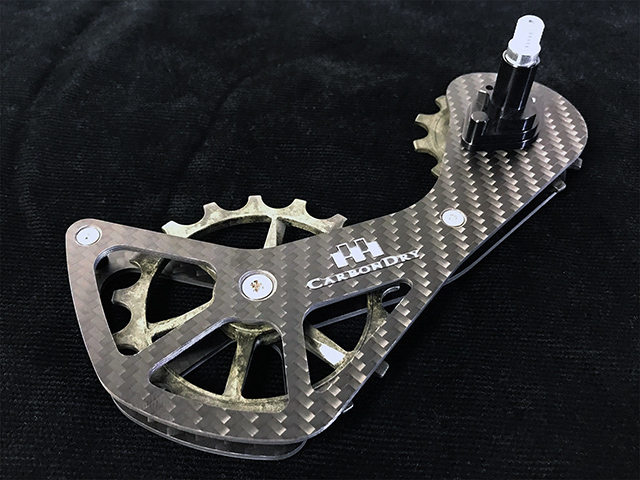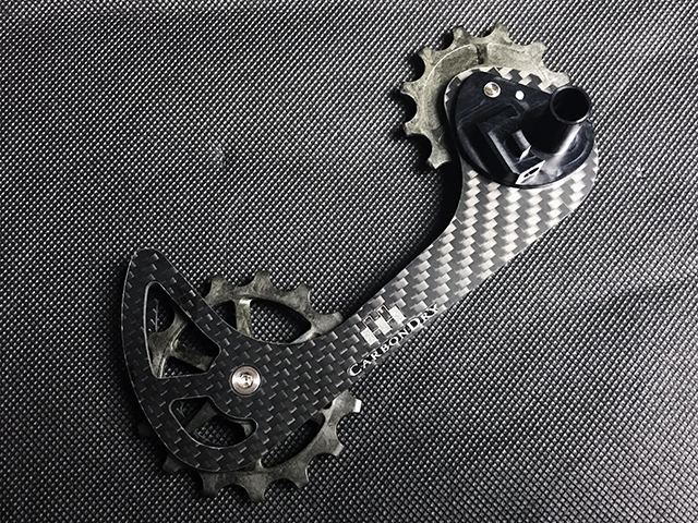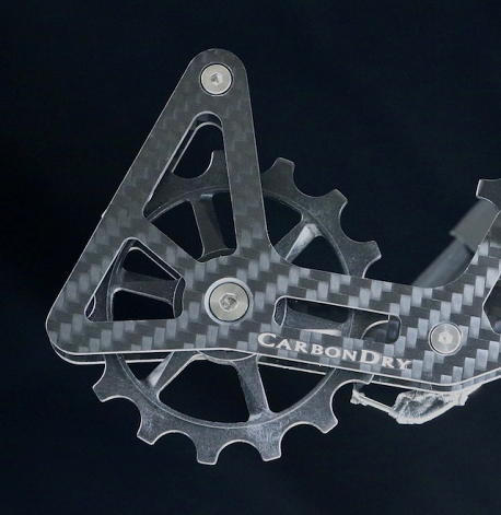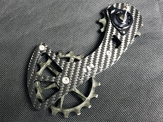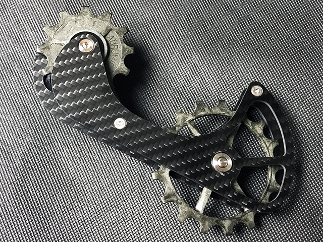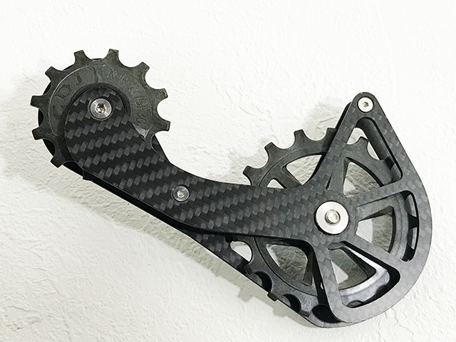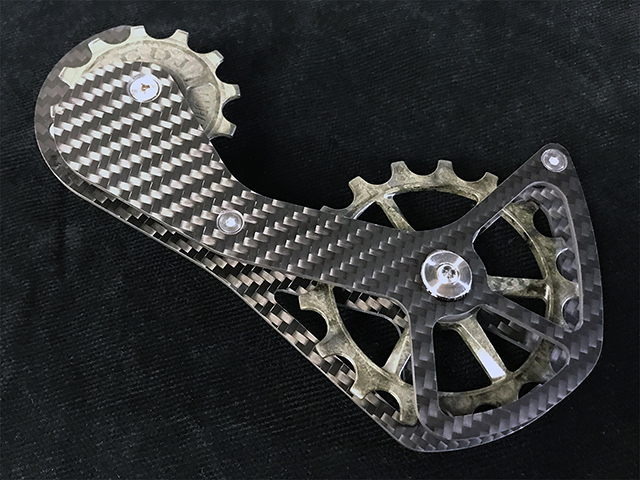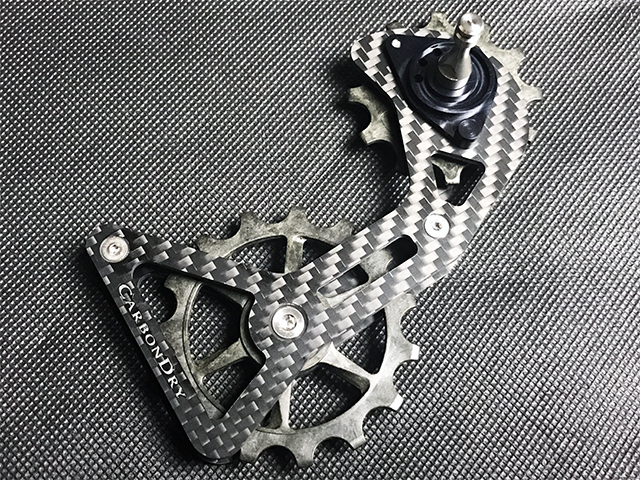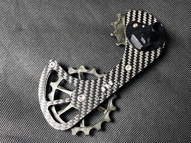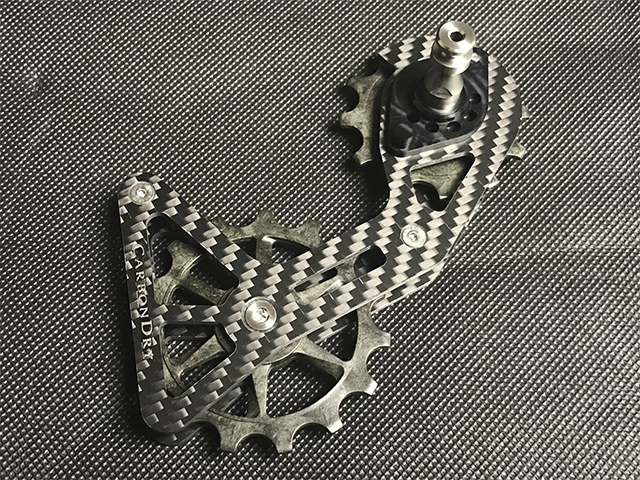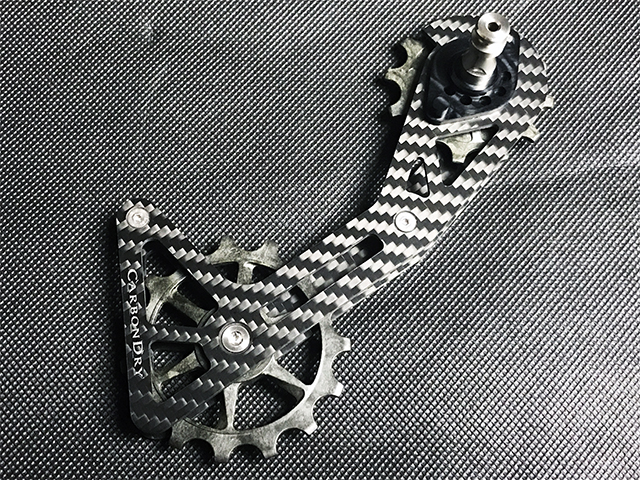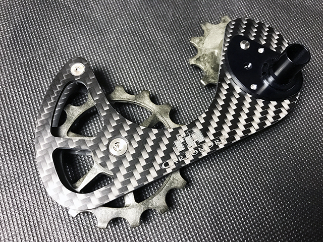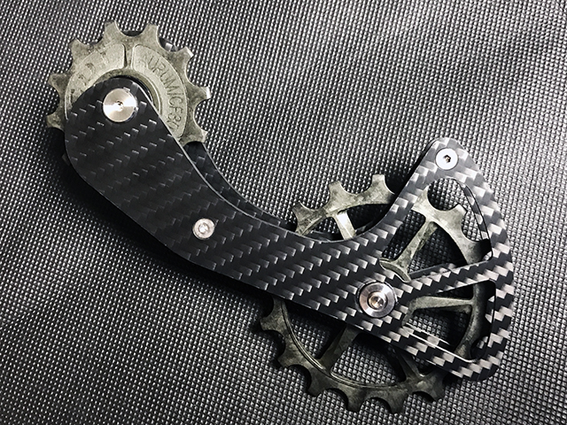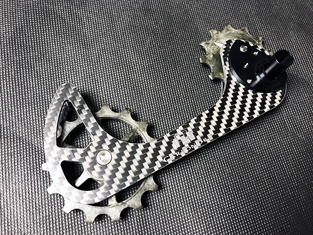 ■プーリーケージはドライカーボンを使用し、マットクリアなヌードカーボン仕上げ。新価格は44、000円 税込