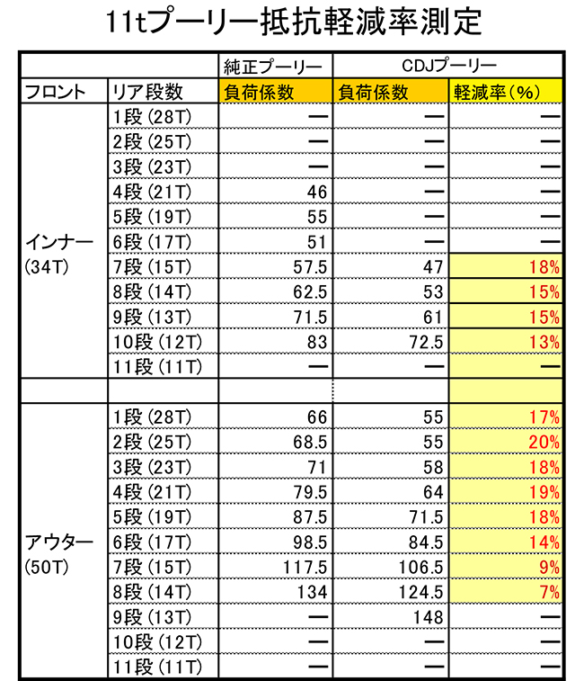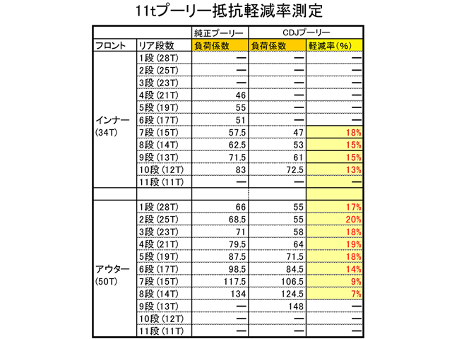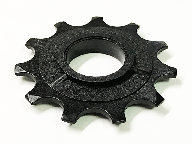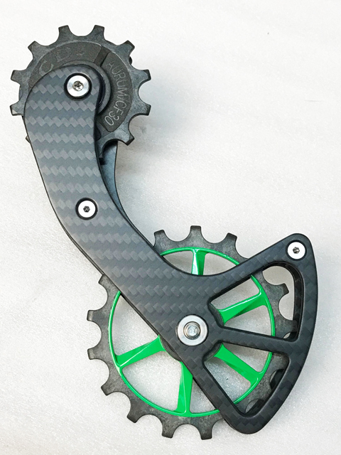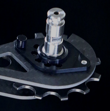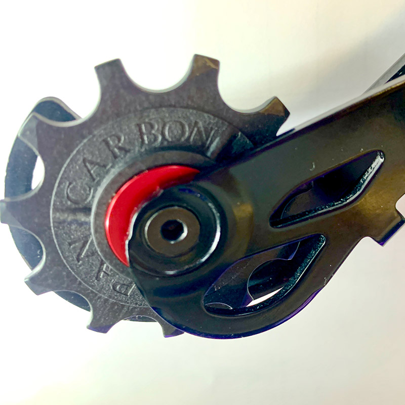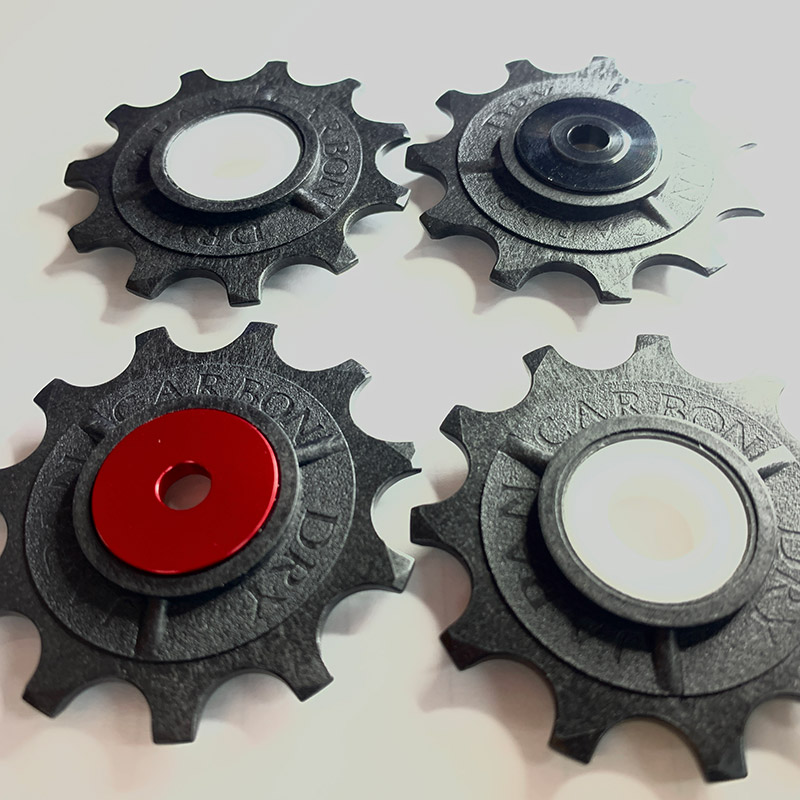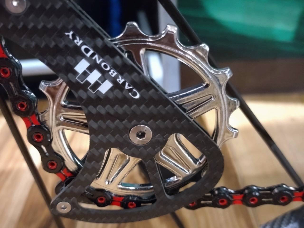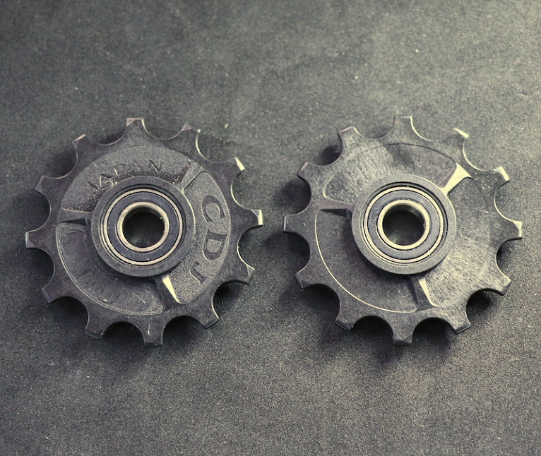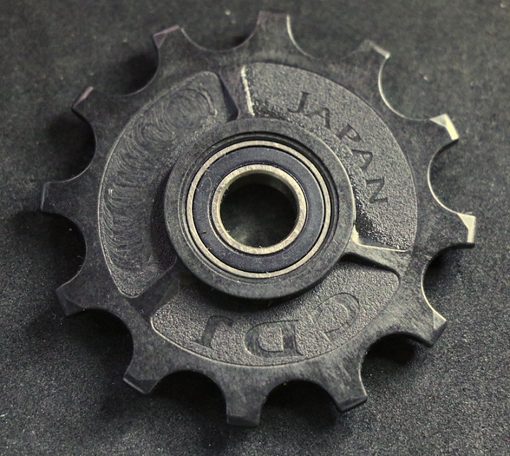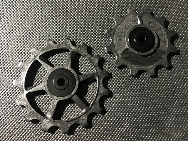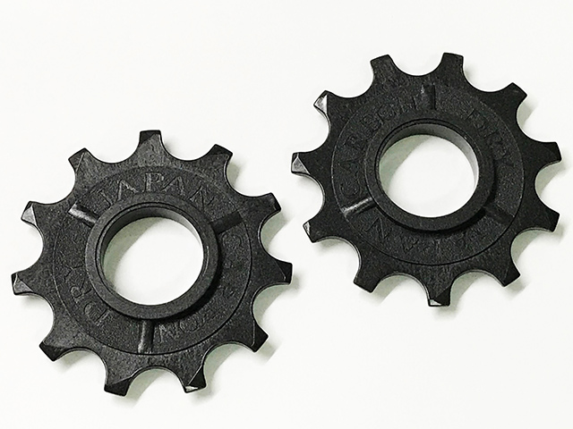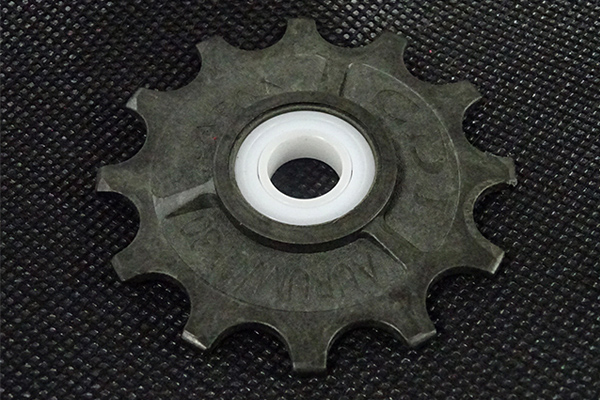 セラミックベアリングを装着してありますので、抵抗軽減に役立ちます。上下合計約0.4gの軽量化です。使用しているPOM+CF10プーリーはチェーン駆動抵抗が低く、静粛性に貢献します。