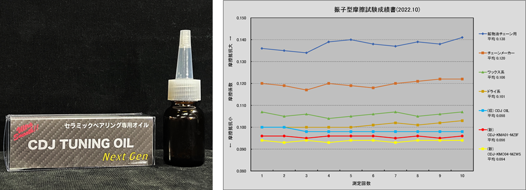旧チューニングオイルの使用実績を基に,高精度ベアリングへの使用を目的として潤滑性,耐久性,浸透性,防錆性,水置換性などの性能を大きく向上させ,過酷な環境下でも使用できる「IF-WS2配合低粘度エステルオイル」です。潤滑材料として,二硫化モリブデンより遥かに強固で,潤滑性や耐荷重性,耐久性が高い航空宇宙関連機器に使用する潤滑材である分子レベルで何層もの球状構造をした「多層フラーレン構造の二硫化タングステン(IF-WS2)」を採用し,低荷重では球が転がって摩擦を軽減し,高荷重では球状の層が滑り剥がれる等して薄い油膜で非常に強固で高い潤滑性能を発揮する固体潤滑チューニングオイルです。
