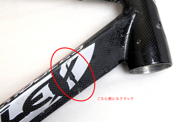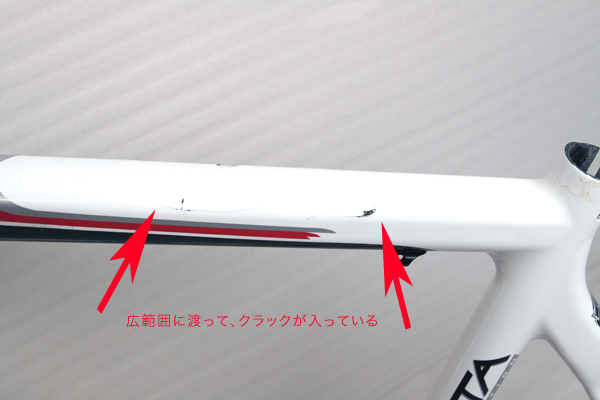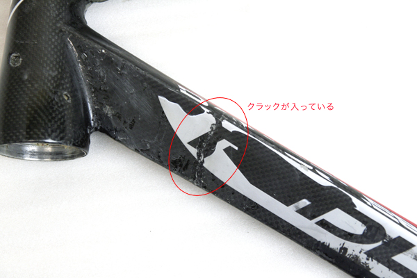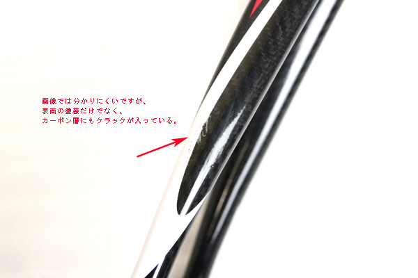 シートステーにクラック。表層は非常に僅かのように見られたが、サンディングするとカーボン素地にもクラック有り。