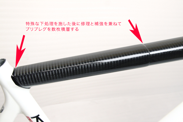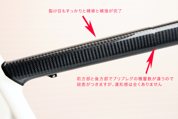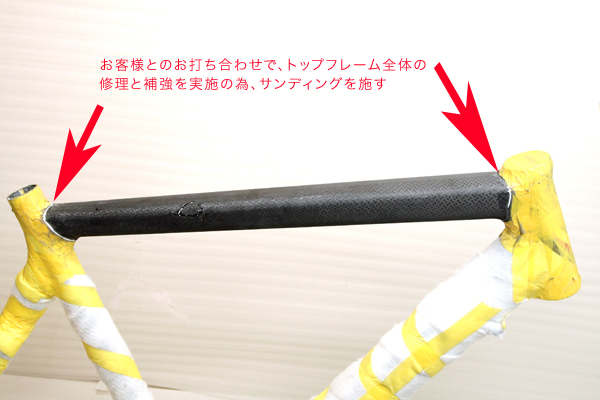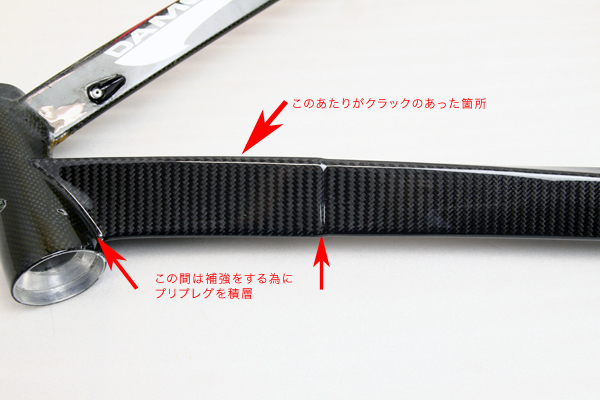 クラック周辺は特殊な下処理を施してから、カーボンプリプレグを積層して補強し、ユーザー様と相談のうえ、トップパイプ全体を