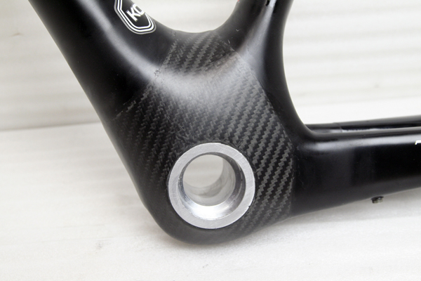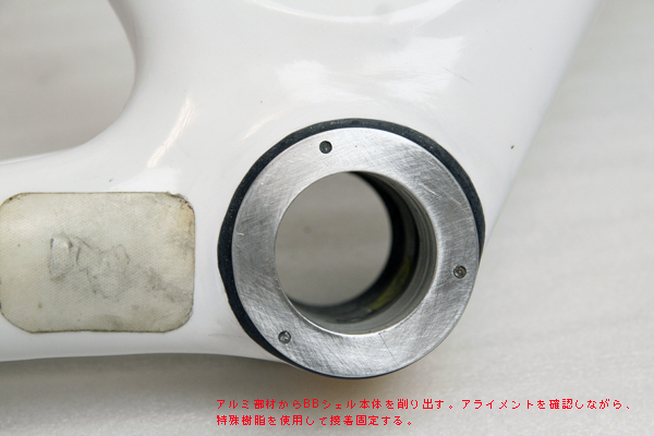そこでアルミ削り出しのワンオフBBを製作し、アライメントを確認しながら、フレーム内に固定。その後フレーム部分の補強を兼ねて