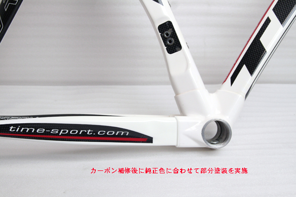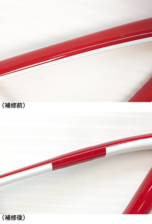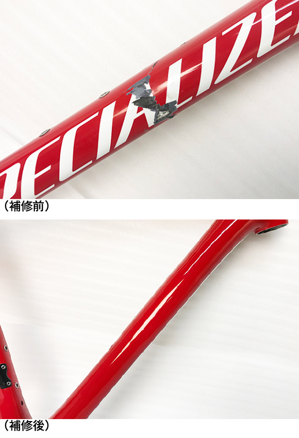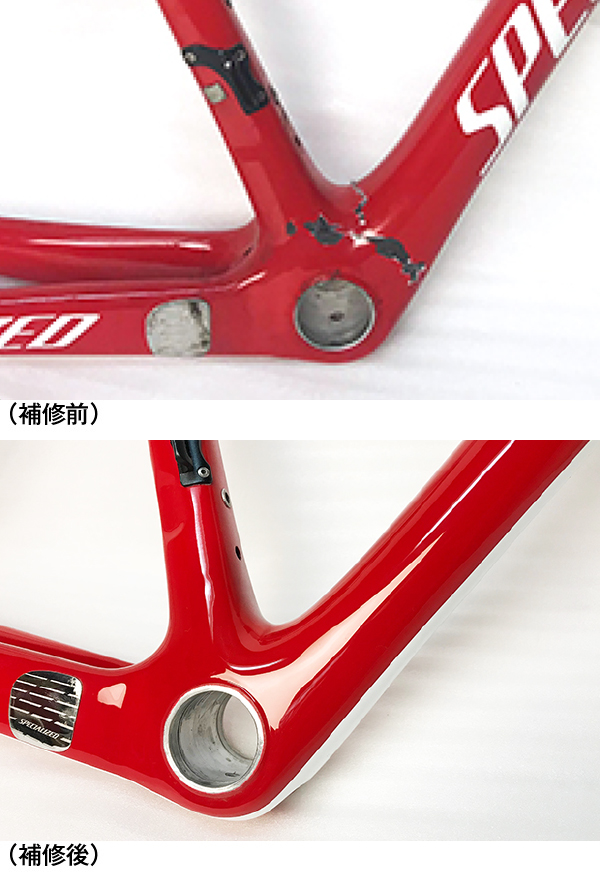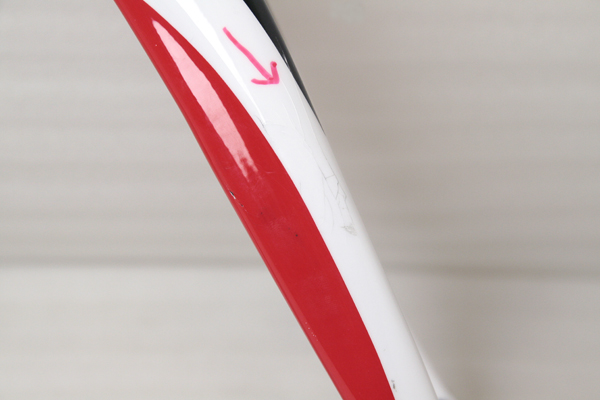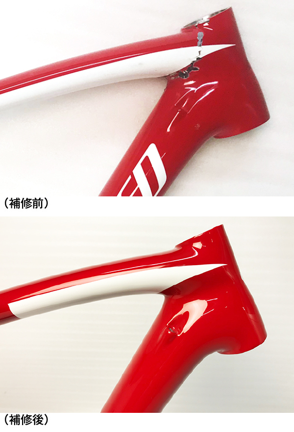 損傷箇所がトップチューブ中央(画像で分かりにくいですが)、前方部ヘッドチューブ、ダウンチューブ中央部、下部(BB至近)と合計4箇所あり、安心して乗れるよう各部をしっかりとカーボン補修を行う。ダウンチューブは範囲が広いのでロゴを全て消去。(勿論復元する事も可能です)ダウンチューブは1色ペイント仕上げ。トップチューブはレッドとホワイトの2色仕上げとなり、基本料金+11,000円(税込)の作業です。