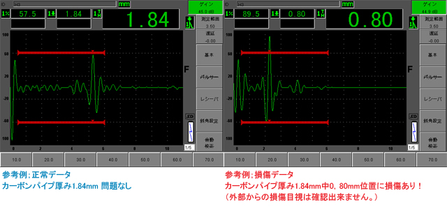 カーボン素材は繊維(糸)の集合体であるため、ダメージが外観上確認しにくいミリ単位以下の小傷でも内部破損が広範囲に発生していることもあり、目視、打音による感覚的な判断検証だけでは実情を把握する事は困難とされてきました。