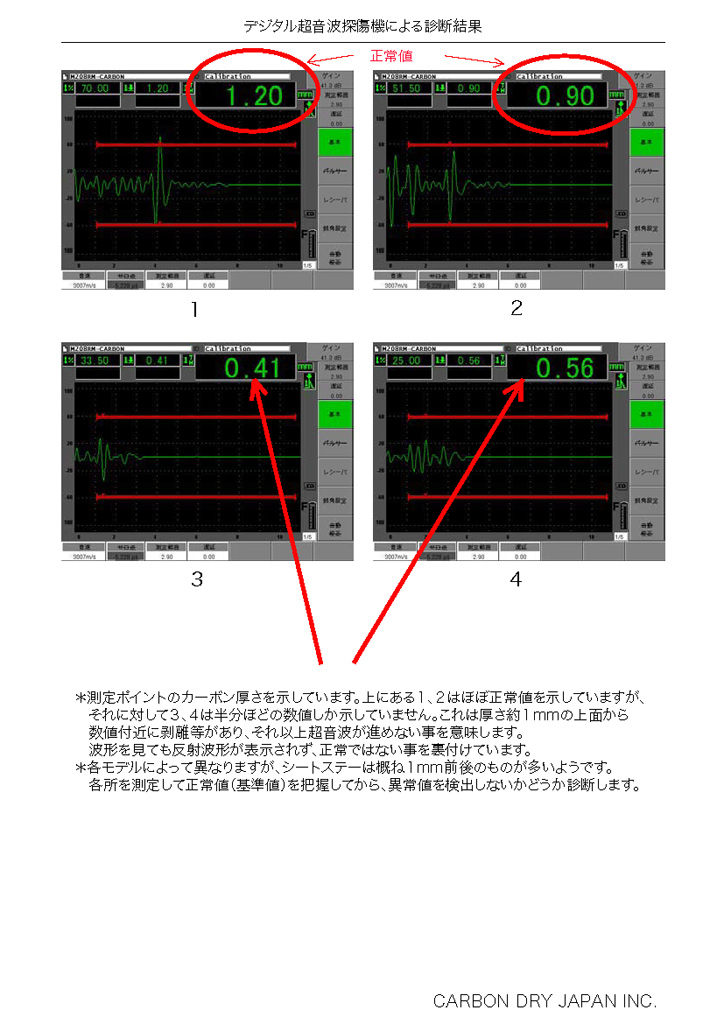 また、構成されているカーボンの厚さも測定できる為、薄い箇所を補強するなどのカーボンチューニングもより具体的にご提案する事が可能です。