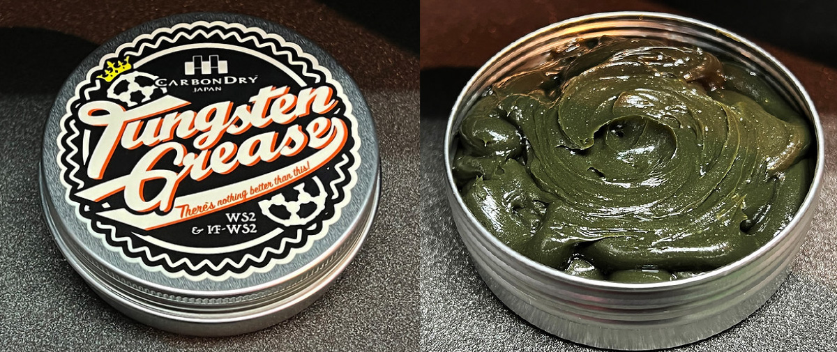 密度の高い金属でドイツ語では【ウォルフラム】(元素記号は【W】)、74番目の元素です。熱で溶けにくいため白熱電球のフィラメントとして長く使用されてきた他、非常に硬く(合金の場合)、重く、環境への毒性が低いためルアーなどの釣り具などにも使用されています。このタングステンと硫黄との化合物である二硫化タングステンが当グリスのコア潤滑成分です。黒い色が特徴的な、超高圧対応で環境にも優しい潤滑成分です。