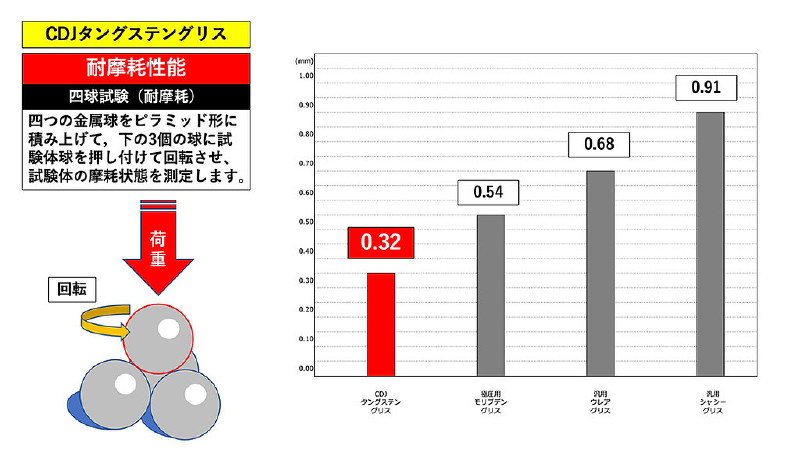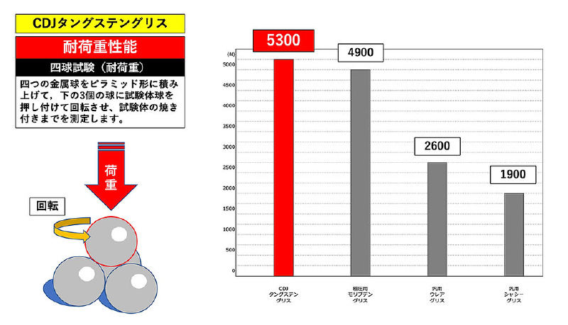 メタル同士の隙間に入り込みベアリングの球のように「支えて転がす」働きで、他に類を見ないほど圧倒的な耐圧性、極圧性能を誇る。発電所や航空宇宙開発の現場、各種大型重機など、高圧かつ過酷な状況下で使用される壊れると困る重要な部分の潤滑に大活躍しています。