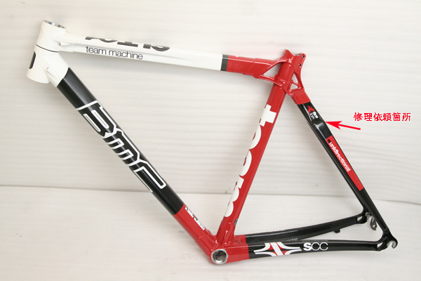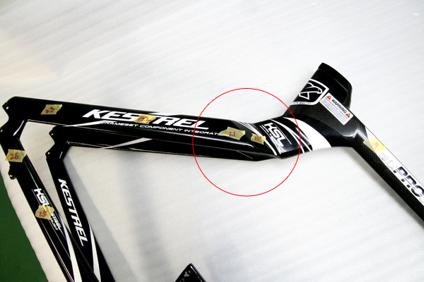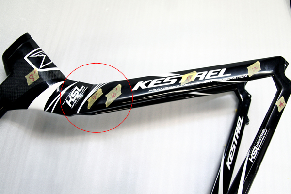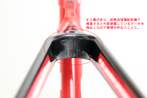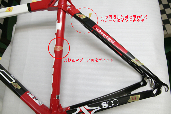 ※このように目視では判断できない場合でも超音波探傷診断機を使用する事によって、弱くなっている箇所(ウィークポイント)を探しだす事が可能です。レースやロングライドによく使用されるユーザー様にはお勧め致します。