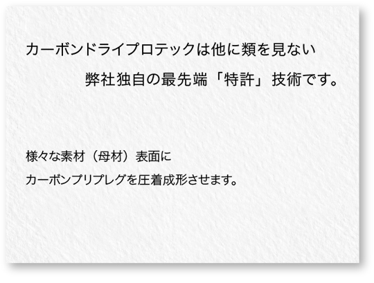 カーボンドライ“プロテック”は弊社独自の最先端<特許>技術です。様々な素材(母材)表面にカーボンプリプレグを圧着成形させます。